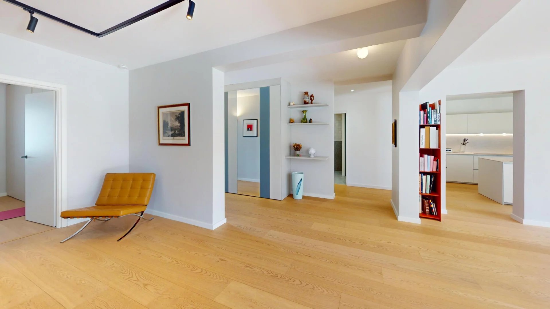 Pour profiter pleinement de l’expérience, nous vous conseillons de visionner la vidéo, pour cela il est nécessaire de cliquer sur la flèche du bas et lancer la vidéo. Vous pourrez également vous promener dans les espaces en utilisant les flèches.