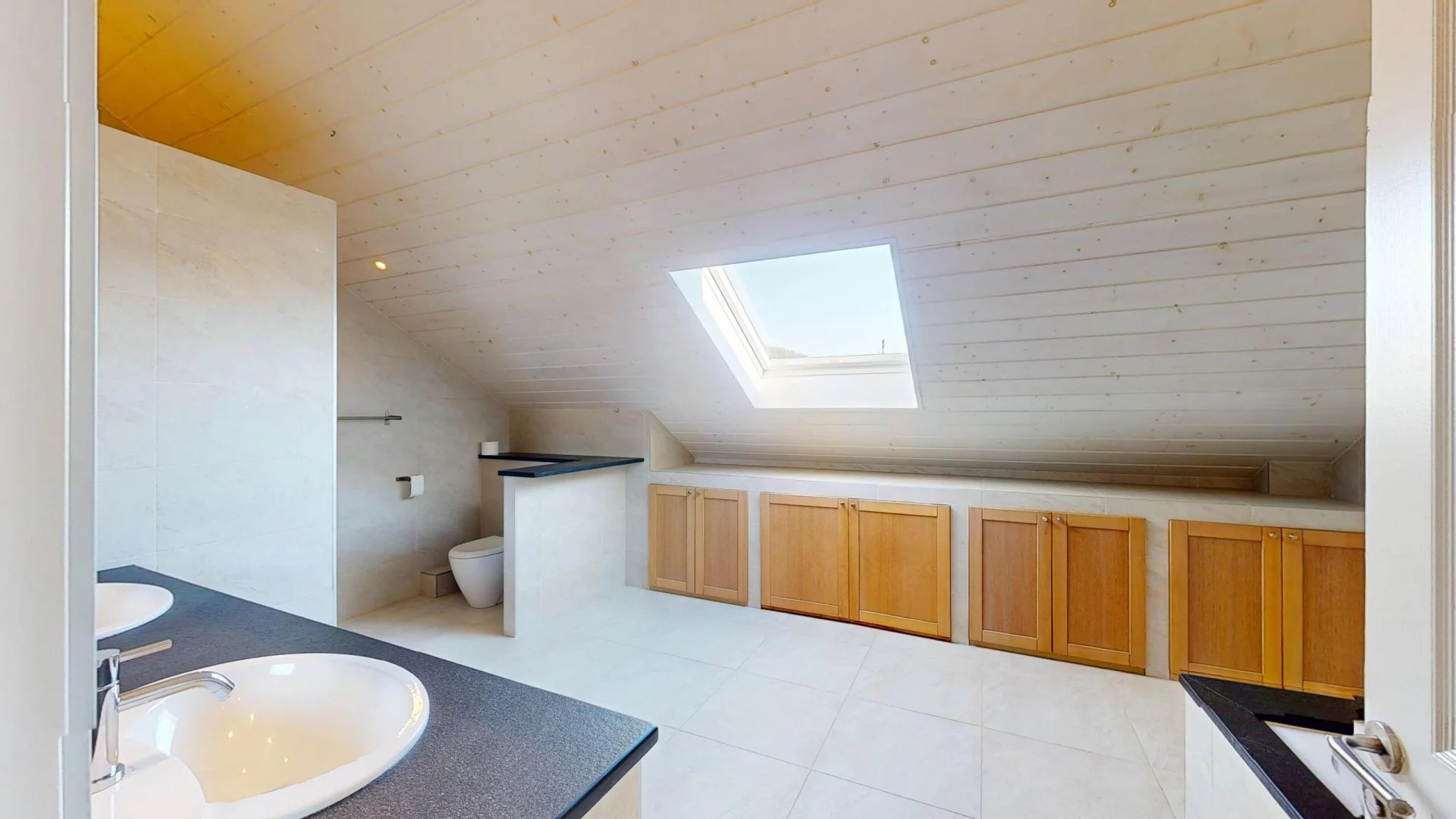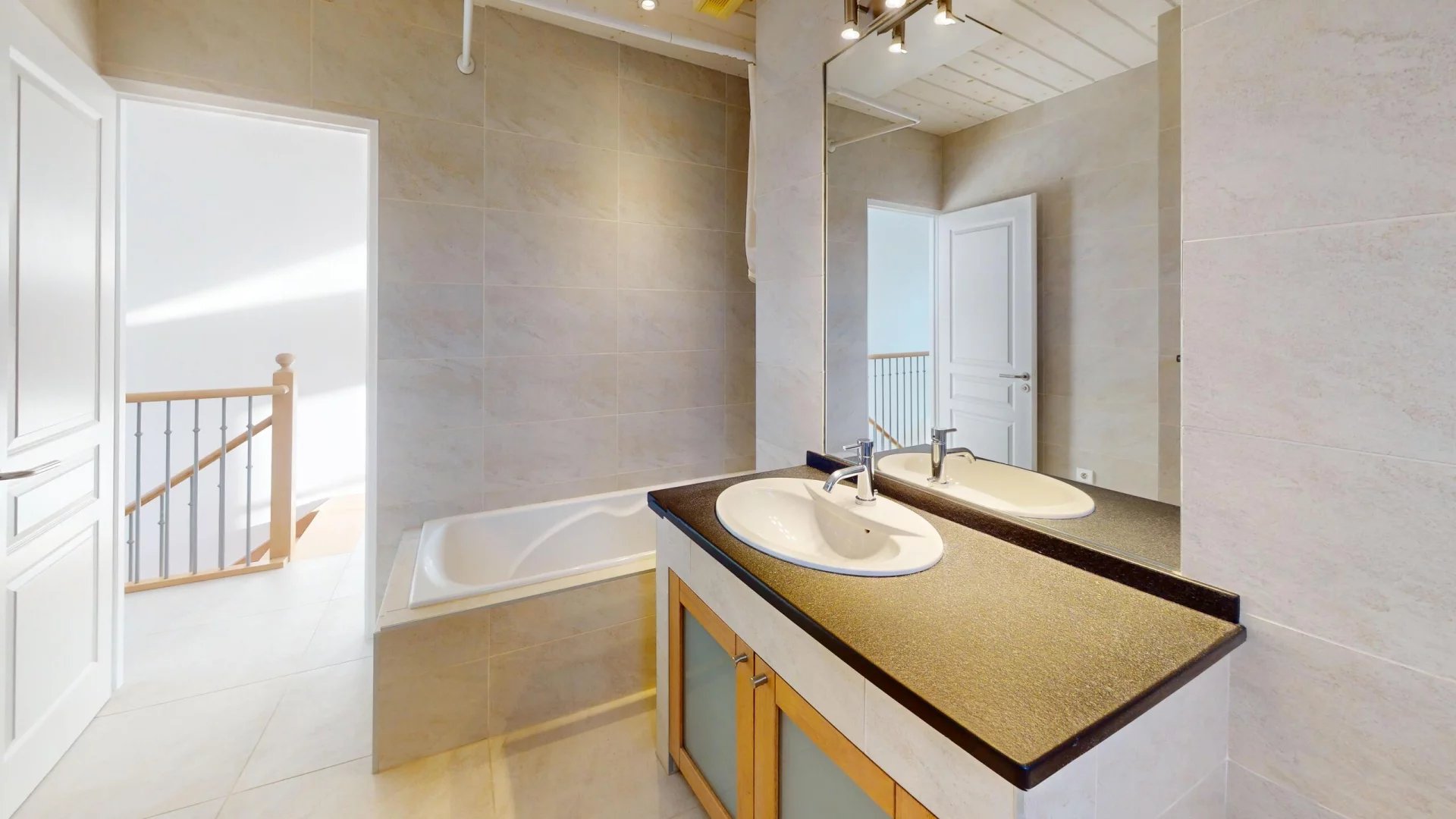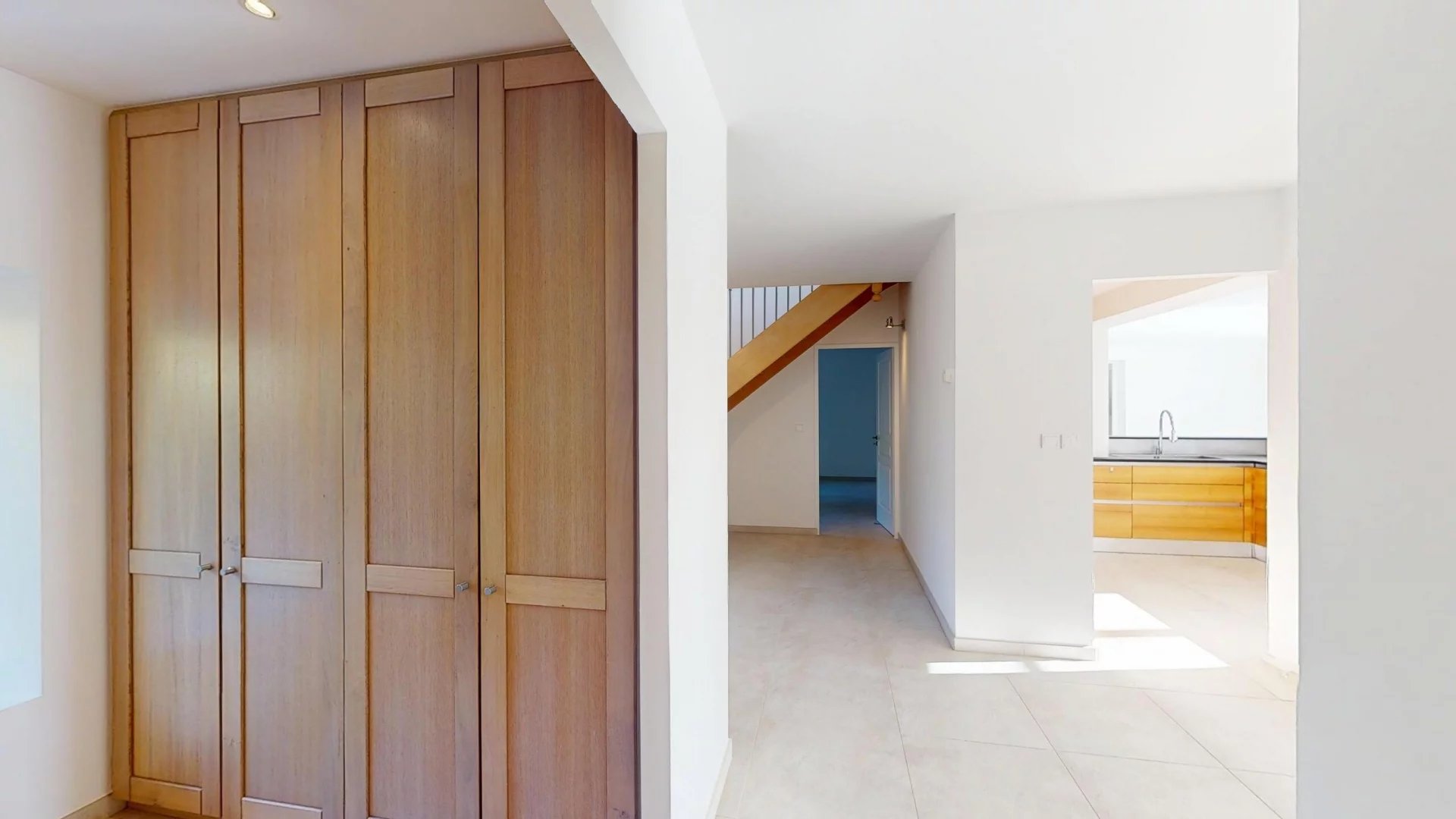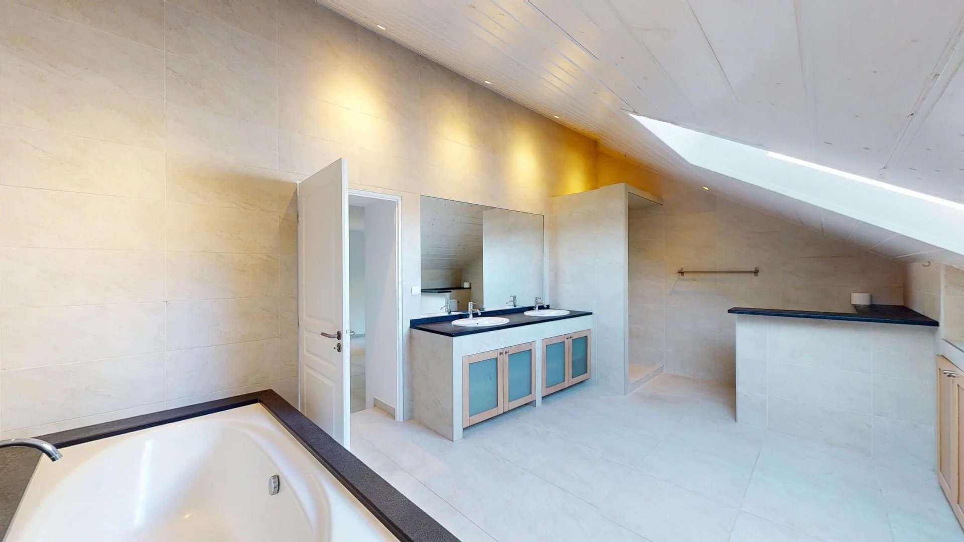 Ce niveau comprend également une entrée spacieuse avec rangements sur mesure, un espace polyvalent pouvant faire office de salon TV ou de chambre supplémentaire, une suite parentale avec salle de bains privative (douche à l’italienne, baignoire, WC), ainsi qu’un WC visiteurs.