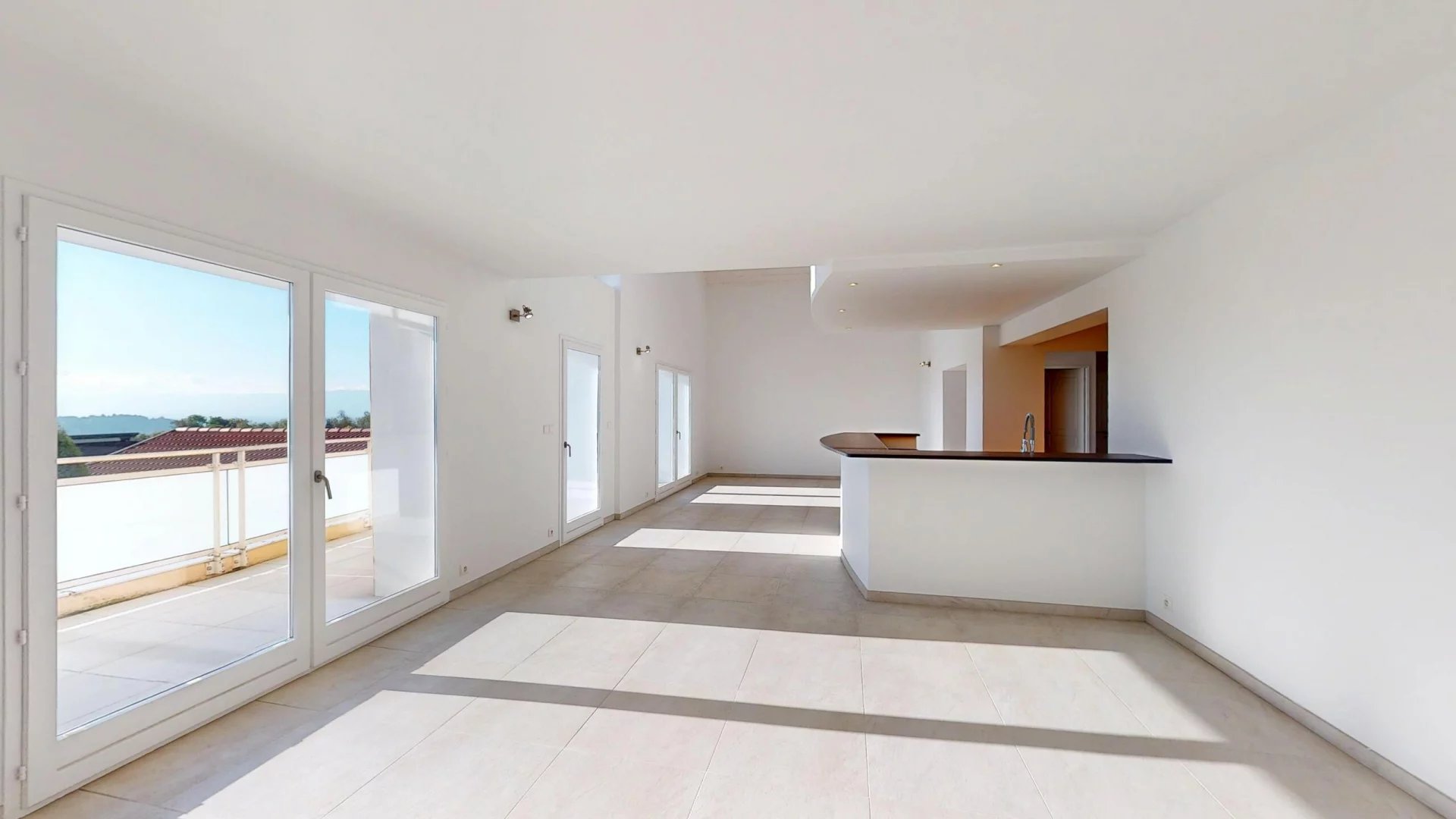 Le premier niveau propose un vaste espace de vie de plus de 60 m², comprenant une cuisine américaine, ouverte sur un salon-salle à manger raffiné, avec un accès direct à une belle terrasse exposée sud-ouest offrant une vue dégagée.