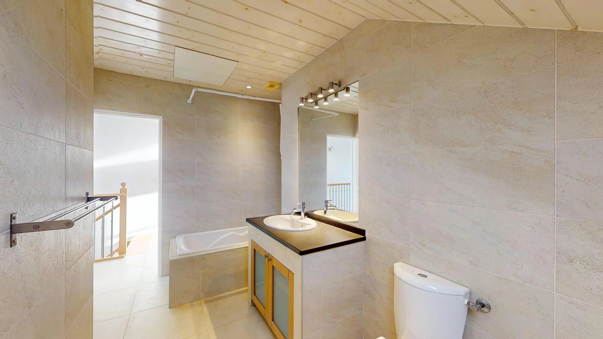 À l’étage, une grande mezzanine idéale pour un bureau, deux chambres confortables et une salle de bains avec WC viennent compléter l’ensemble.